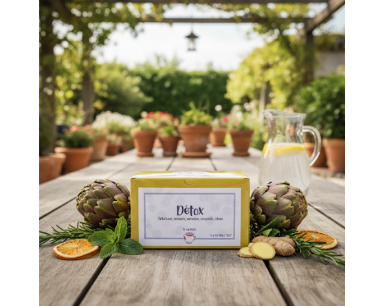 Découvrez notre tisane Détox, une infusion revitalisante aux notes végétales et citronnées, spécialement élaborée pour aider votre organisme à se purifier en douceur. Chaque tasse révèle l’équilibre parfait entre l’artichaut et le pissenlit, reconnus pour soutenir les fonctions d’élimination, et le romarin, qui stimule naturellement la digestion. La verveine apporte une touche apaisante, tandis que le citron diffuse sa fraîcheur vivifiante pour une sensation de légèreté. Avec Détox, offrez à votre corps un moment de renouveau et retrouvez énergie et bien-être jour après jour.