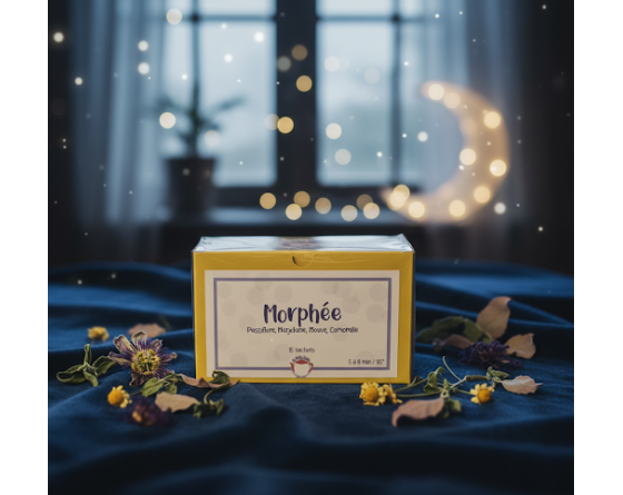 Découvrez la Tisane Morphée, une harmonie apaisante de Passiflore, Mauve (fleurs et feuilles), Marjolaine et Camomille. Chaque gorgée vous enveloppe de douceur et de tranquillité, idéale pour apaiser l'esprit et favoriser un sommeil réparateur. Parfait pour trouver le calme et la sérénité après une journée bien remplie.