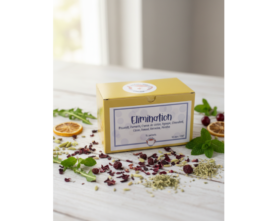 Réf.: 019Découvrez la Tisane Élimination, une infusion naturelle spécialement conçue pour favoriser le drainage et l'élimination des toxines de votre corps. Ce mélange unique réunit les vertus purifiantes et détoxifiantes de plantes sélectionnées avec soin : Pissenlit, Romarin, Queues de Cerise, Hysope, Chiendent, Fenouil, Verveine, Menthe, et Citron. Pissenlit, reconnu pour ses propriétés diurétiques, aide à éliminer les toxines et à purifier le foie. Romarin contribue à la digestion et soutient le fonctionnement hépatique. Queues de Cerise, diurétiques et dépuratives, facilitent l'élimination rénale de l'eau et des déchets. Hysope favorise la digestion et possède des propriétés expectorantes. Chiendent aide à nettoyer les voies urinaires et à éliminer les toxines. Fenouil soutient la digestion et réduit les ballonnements. Verveine, apaisante et digestive, aide à réduire le stress et à améliorer la digestion. Menthe, rafraîchissante et digestive, aide à soulager les troubles digestifs. Citron apporte une touche de fraîcheur et de vitamine C, renforçant ainsi les défenses naturelles.